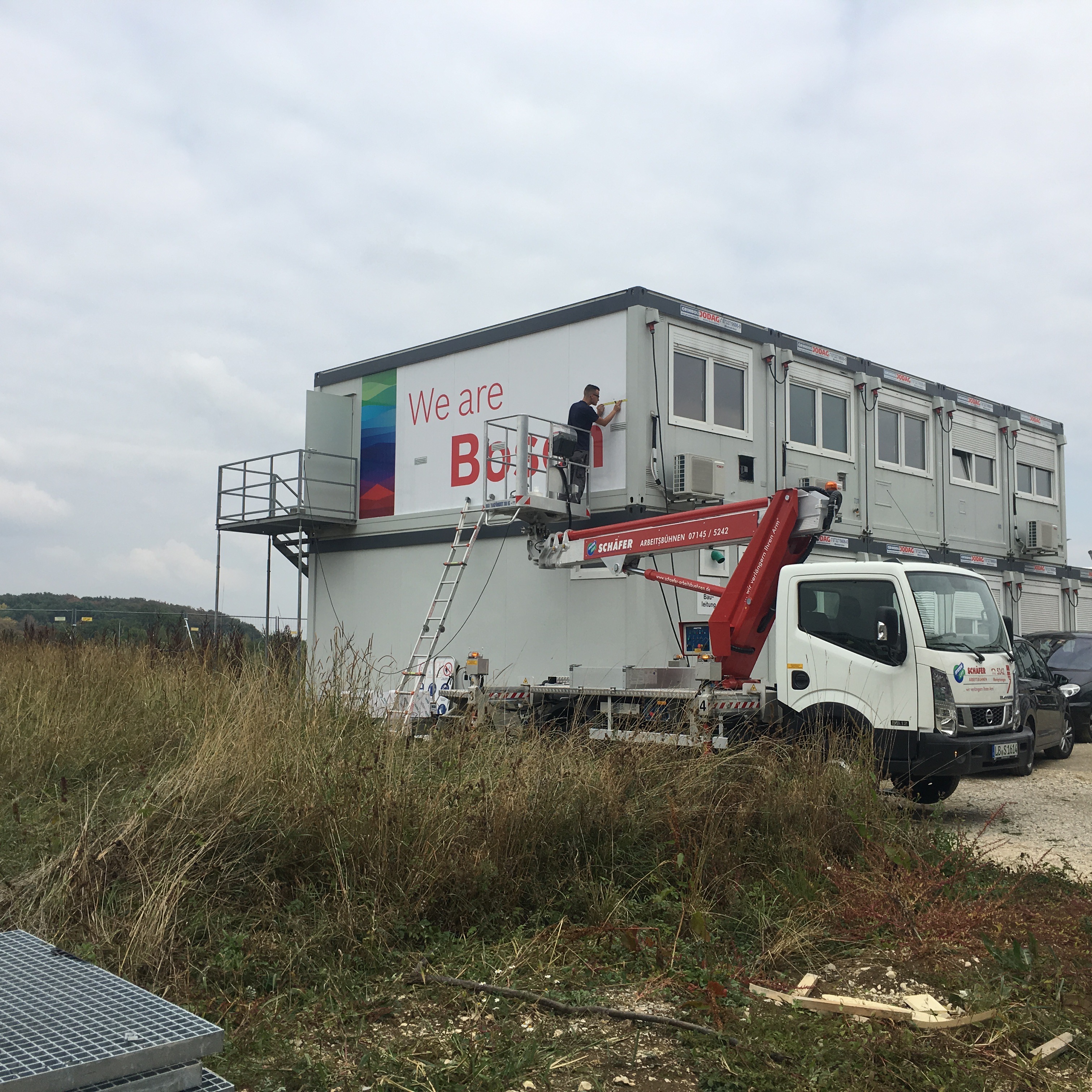 Wenn kein Platz auf der Baustelle vorhanden ist, um ein Bauschild zu stellen, bieten wir Ihnen die optimale Lösung auch ohne Konstruktion an. Dazu gehören z.B. das Bekleben von Baucontainern oder Fassaden. Durch eine große Auswahl an speziellen Folien haben wir für jeden Untergrund das perfekte Beschriftungsergebnis. Selbst bei "speziellen" Untergründen haben wir für Sie eine Lösung.